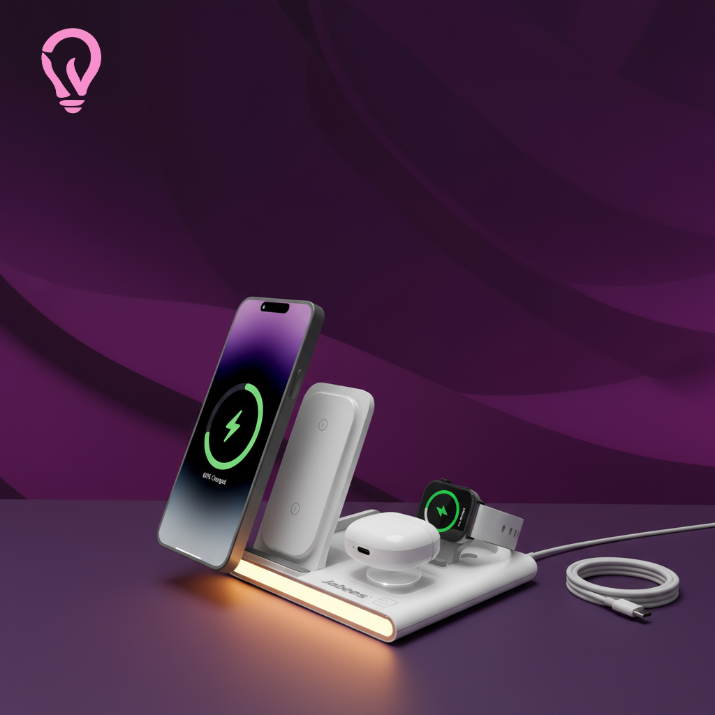 Przedstawiamy Jabees PowerGlow, wszechstronną bezprzewodową stację ładującą 4-w-1, która na nowo definiuje sposób ładowania Twoich niezbędnych urządzeń. Dzięki możliwości jednoczesnego ładowania iPhone'a, AirPods, Apple Watch i szeregu urządzeń obsługujących Qi,